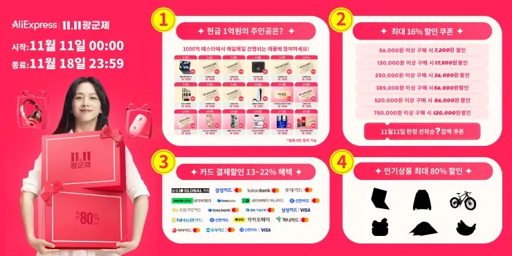 2024년 11월 11일 자정부터 11월 18일 자정까지 진행되는 알리익스프레스의 대규모 할인 행사, 광군제! 모든 품목에 적용되는 최신 할인 코드와 카드 할인 정보를 확인해보세요.