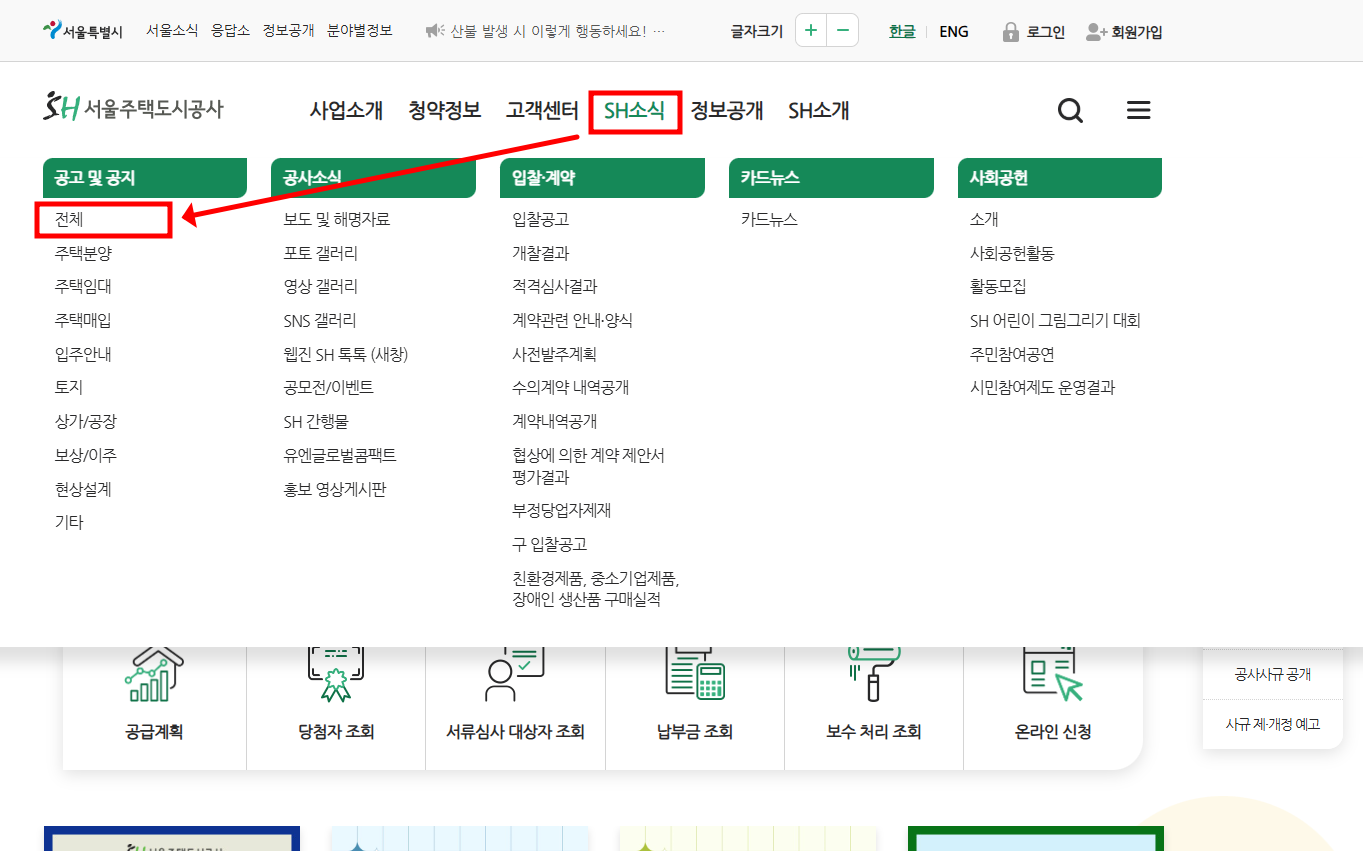 - 열람 경로: 홈페이지 > SH소식 > 공고 및 공지 > 전체